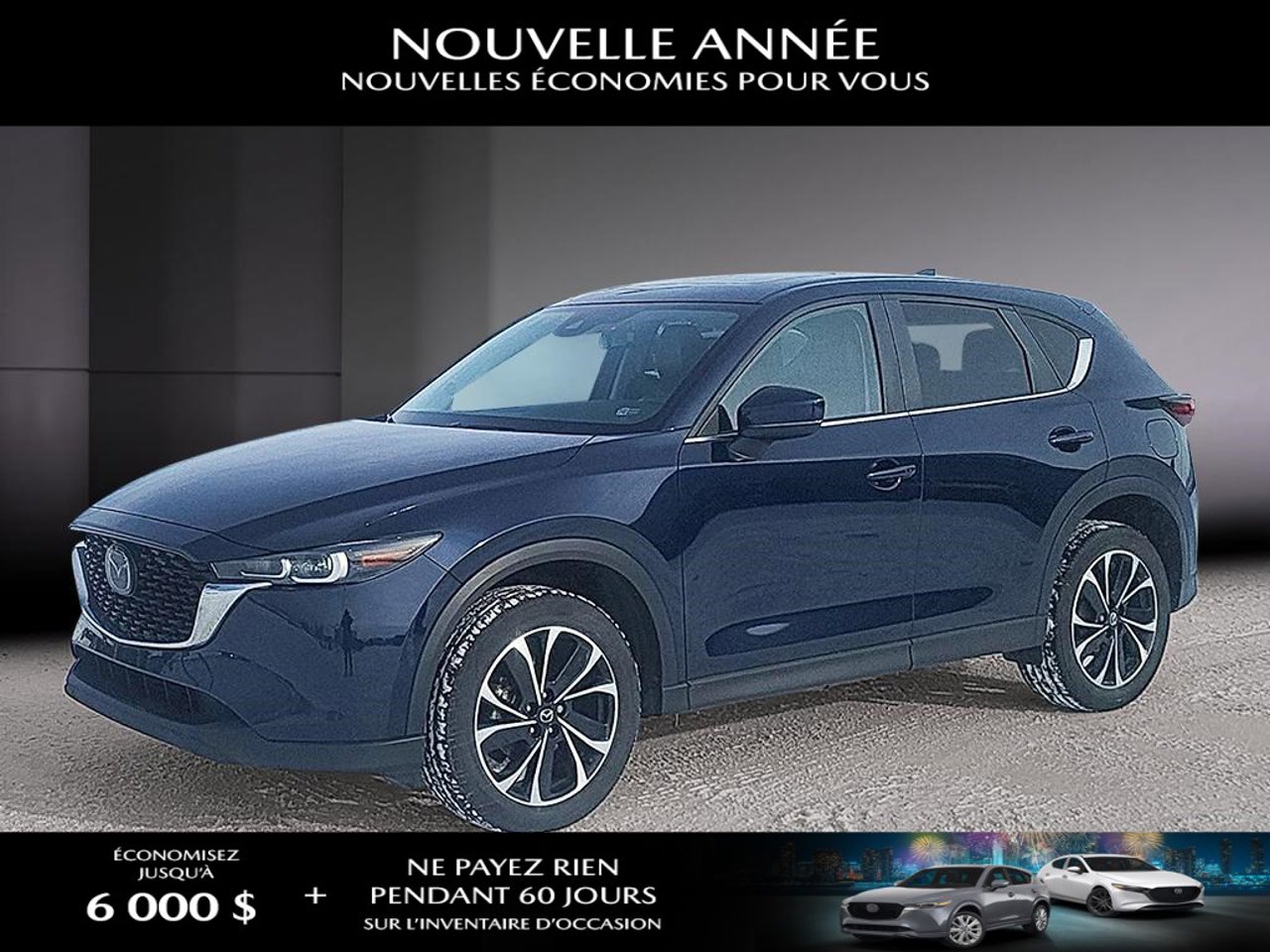 ▲ La prime d’événement de 500 $/750 $/1 000 $/ 4 000 $ (« Boni ») est offerte pour les modèles Mazda3 2025, Mazda3 Sport 2025/ CX-5 2025/CX-30 2025, CX-90 MHEV 2025, CX-70 MHEV 2025/CX-90 PHEV 2025, CX-70 PHEV 2025 neufs et non enregistrés qui sont achetés ou financés/loués (sur approbation de crédit) et livrés entre le 3 janvier et le 2 février 2026 par un détaillant autorisé Mazda au Canada. La prime sera appliquée au prix de vente négocié du véhicule admissible avant les taxes et : (i) n’a aucune valeur de rachat ou d’autre valeur; et (ii) ne peut pas être appliquée aux transactions antérieures. Des conditions s’appliquent. Consultez mazda.ca ou votre détaillant Mazda local pour plus de détails.