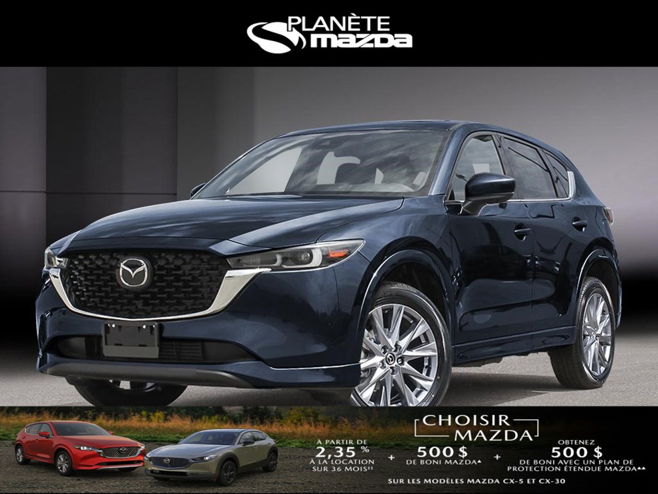 ▲A $500/1,000/$4,000 Event Bonus is available on new and previously unregistered 2025 CX-30, CX-5/ 2025 CX-90 MHEV, CX-70 MHEV/ 2025 CX-90 PHEV, CX-70 PHEV models that are purchased or financed/leased (on approved credit) and delivered between November 1 – December 1, 2025, from an authorized Mazda retailer in Canada. Bonus will be applied to the negotiated selling price of the eligible vehicle before taxes and: (i) has no cash surrender or other value; (ii) does not apply to fleet sales; and (iii) cannot be applied to past transactions. Conditions apply. See mazda.ca or your local Mazda Retailer for details.