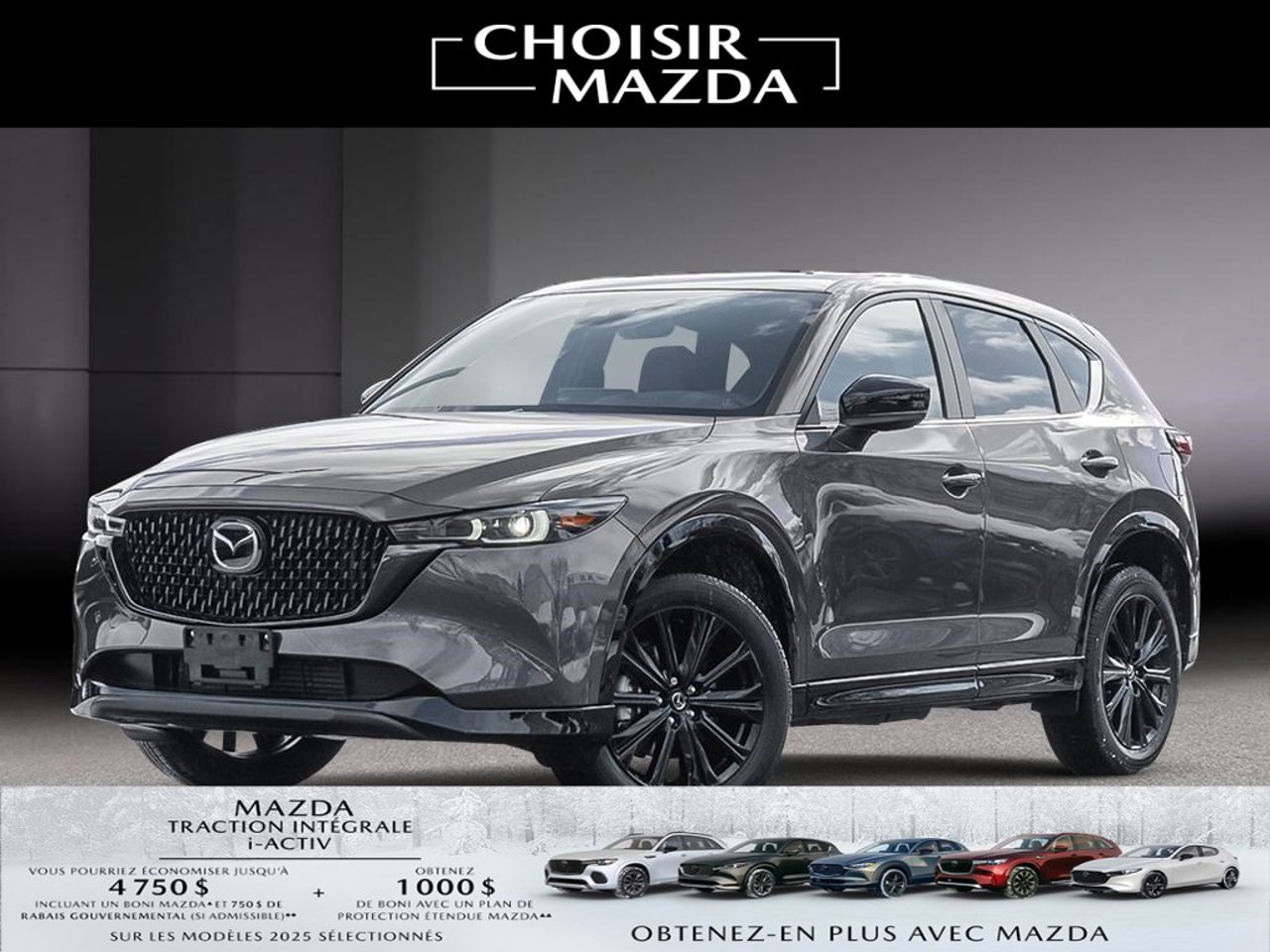 ▲A $500/$750/1,000/$4,000 Event Bonus is available on new and previously unregistered 2025 Mazda3, 2025 Mazda3 Sport/ 2025 CX-5/ 2025 CX-30, 2025 CX-90 MHEV, CX-70 MHEV/ 2025 CX-90 PHEV, 2025 CX-70 PHEV models that are purchased or financed/leased (on approved credit) and delivered between January 3 and February 2, 2026, from an authorized Mazda retailer in Canada. Bonus will be applied to the negotiated selling price of the eligible vehicle before taxes and: (i) has no cash surrender or other value; (ii) does not apply to fleet sales; and (iii) cannot be applied to past transactions. Conditions apply. See mazda.ca or your local Mazda Retailer for details.