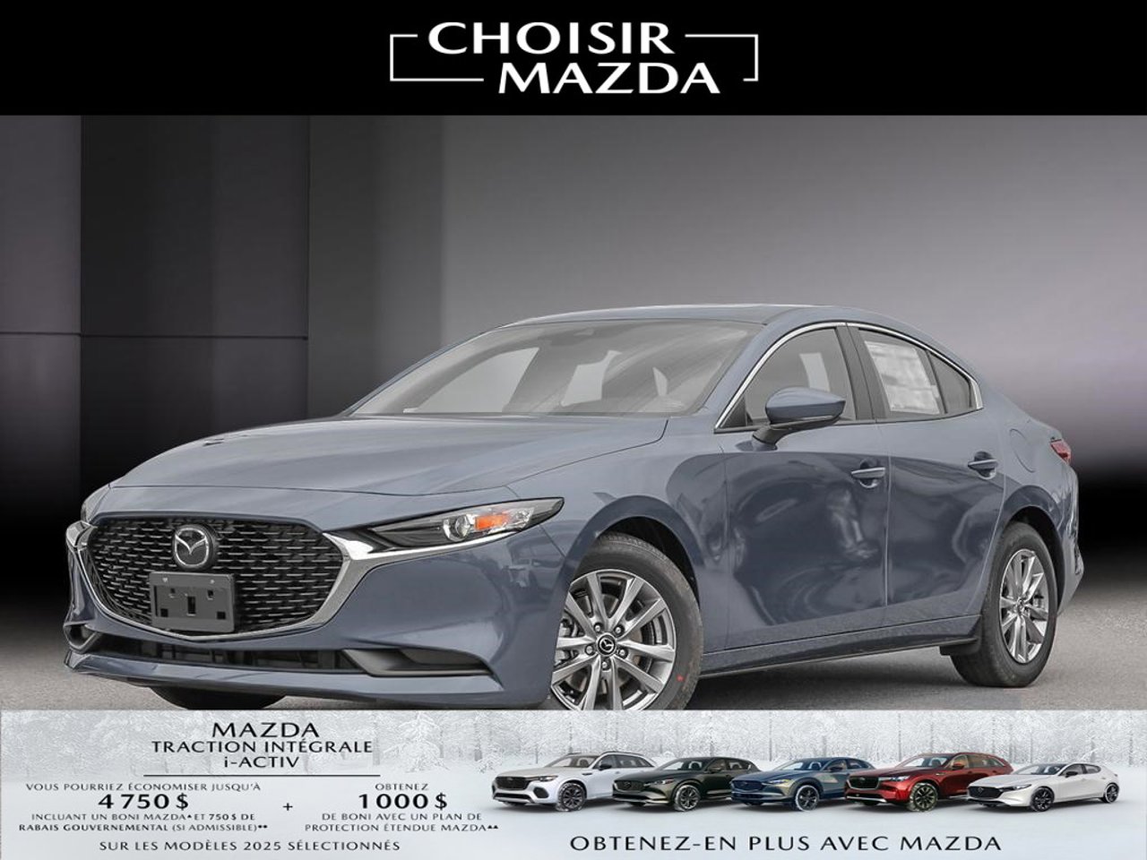 ▲A $500/$750/1,000/$4,000 Event Bonus is available on new and previously unregistered 2025 Mazda3, 2025 Mazda3 Sport/ 2025 CX-5/ 2025 CX-30, 2025 CX-90 MHEV, CX-70 MHEV/ 2025 CX-90 PHEV, 2025 CX-70 PHEV models that are purchased or financed/leased (on approved credit) and delivered between January 3 and February 2, 2026, from an authorized Mazda retailer in Canada. Bonus will be applied to the negotiated selling price of the eligible vehicle before taxes and: (i) has no cash surrender or other value; (ii) does not apply to fleet sales; and (iii) cannot be applied to past transactions. Conditions apply. See mazda.ca or your local Mazda Retailer for details.