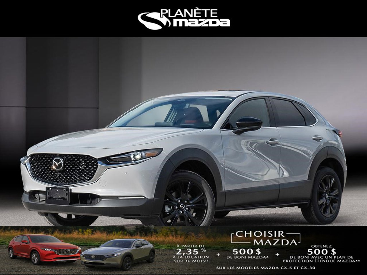 ▲ La prime d’événement de 500 $/ $/1 000 $/ 4 000 $ (« Boni ») est offerte pour les modèles CX-30 2025, CX-5 2025/ CX-90 MHEV 2025, CX-70 MHEV 2025/CX-90 PHEV 2025, CX-70 PHEV 2025 neufs et non enregistrés qui sont achetés ou financés/loués (sur approbation de crédit) et livrés entre le 1er novembre et le 1er décembre 2025 par un détaillant autorisé Mazda au Canada. La prime sera appliquée au prix de vente négocié du véhicule admissible avant les taxes et : (i) n’a aucune valeur de rachat ou d’autre valeur; et (ii) ne peut pas être appliquée aux transactions antérieures. Des conditions s’appliquent. Consultez mazda.ca ou votre détaillant Mazda local pour plus de détails.