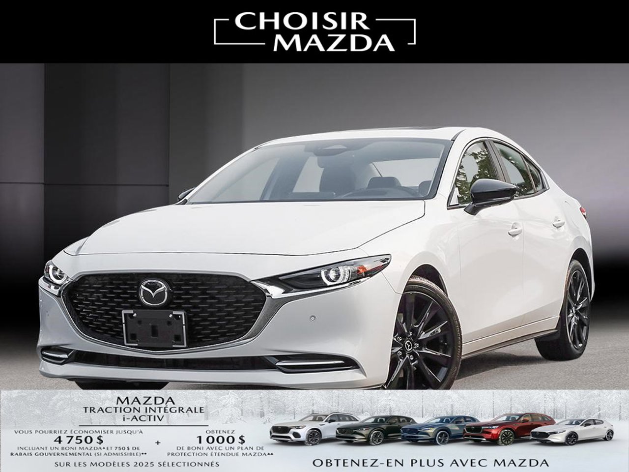 ▲ La prime d’événement de 500 $/750 $/1 000 $/ 4 000 $ (« Boni ») est offerte pour les modèles Mazda3 2025, Mazda3 Sport 2025/ CX-5 2025/CX-30 2025, CX-90 MHEV 2025, CX-70 MHEV 2025/CX-90 PHEV 2025, CX-70 PHEV 2025 neufs et non enregistrés qui sont achetés ou financés/loués (sur approbation de crédit) et livrés entre le 3 février et le 2 mars 2026 par un détaillant autorisé Mazda au Canada. La prime sera appliquée au prix de vente négocié du véhicule admissible avant les taxes et : (i) n’a aucune valeur de rachat ou d’autre valeur; et (ii) ne peut pas être appliquée aux transactions antérieures. Des conditions s’appliquent. Consultez mazda.ca ou votre détaillant Mazda local pour plus de détails.