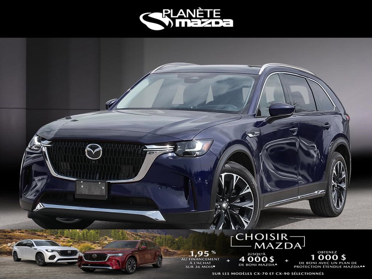 ▲▲ Profitez d’un boni supplémentaire à l’achat d’un plan de Protection étendue Mazda lors de l’achat d’un modèle neuf et non immatriculé entre le 1er novembre et le 1er décembre, comme suit : (i) Boni de 1 000 $ : CX-70 2025, CX-90 2025. Le boni sera appliqué au prix d’achat du plan de Protection étendue Mazda avant taxes et : (i) n’a aucune valeur de rachat en espèces ni autre valeur; (ii) ne peut être appliqué aux véhicules de parc automobile; et (iii) ne peut être appliqué aux transactions antérieures. Des conditions s’appliquent. Consultez Mazda.ca ou votre détaillant Mazda local pour plus de détails.